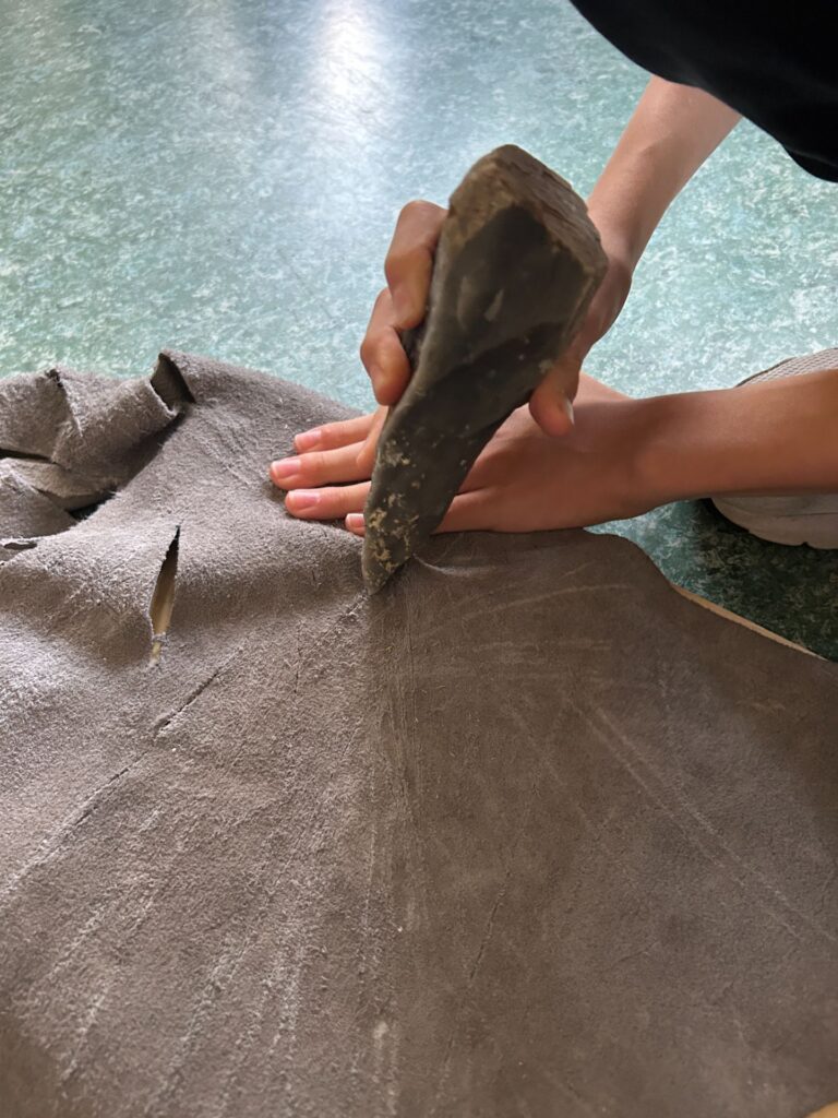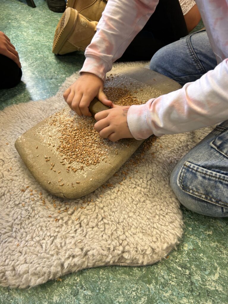 Nach einer kurzen Orientierung in der Zeit erfuhren die Schülerinnen und Schüler anhand von anschaulichen Illustrationen und kurzen Filmen, wie die Jäger und Sammler im eiszeitlichen Europa lebten. Anschließend durften sie selbst aktiv werden: Mit Repliken steinzeitlicher Werkzeuge wie Faustkeil, Bohrer und Mahlstein probierten sie aus, wie mühsam das Schneiden, Bohren und Mahlen in der Steinzeit war.