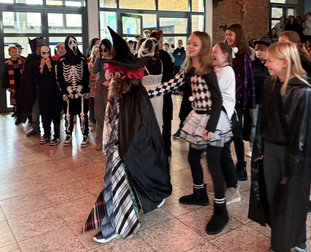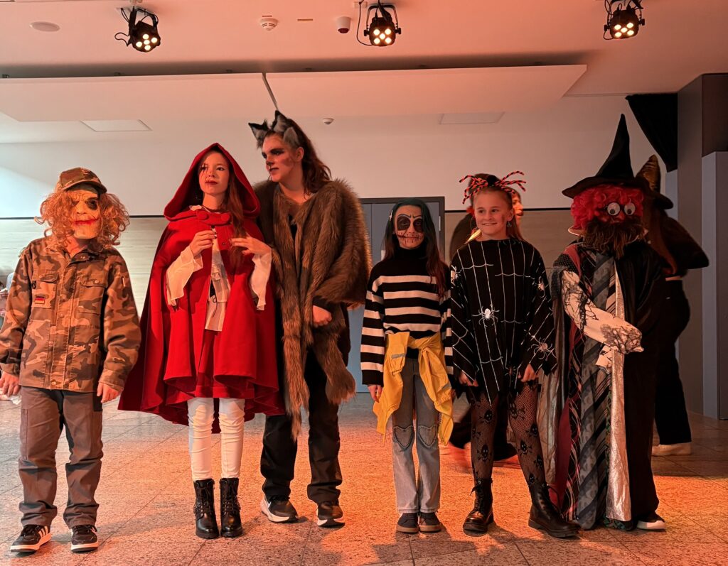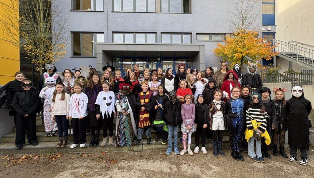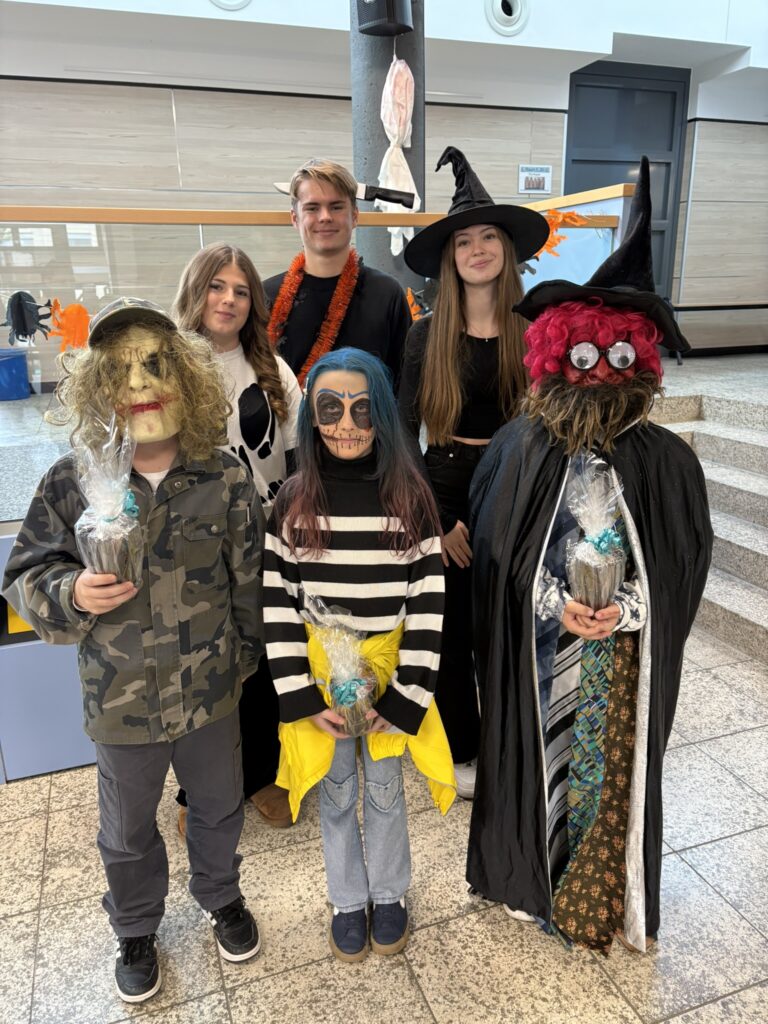 Am Freitag vor den Herbstferien verwandelte sich unsere Aula in eine bunte Mischung aus Gespenstern, Hexen und Superhelden. Einige Schülerinnen und Schüler kamen verkleidet in die Schule und sorgte für ausgelassene Stimmung in der Halloween-Pause. Die SMV organisierte einen Kostümwettbewerb, bei dem die kreativsten Verkleidungen prämiert wurden. Die drei lautesten Jubelrufe gingen schließlich an die besten Kostüme des Tages, die mit kleinen Preisen belohnt wurden. Ein Herzliches Dankeschön gilt an alle Mitwirkenden, die diese fröhliche Aktion möglich gemacht haben.
